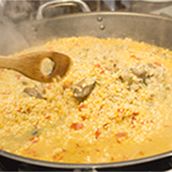 Add the oysters and the clams and make sure the preparation in always wet by adding broth regularly in the center of the paella, constantly stirring. Cook for about 20 minute or until the rice is almost done.