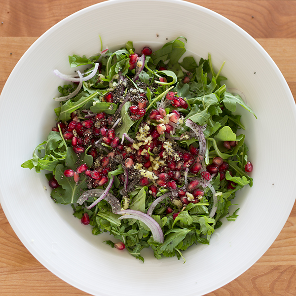 For the salad, chop arugula and place in a large bowl with pomegranate and minced onion. Add cilantro leaves, ginger, and chia seeds.